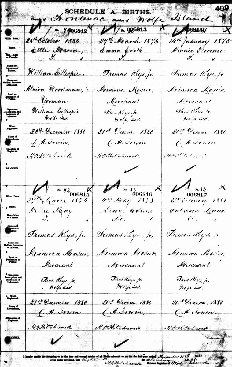 Records created at the time of an event are considered to be 'primary' and the most accurate documents reflecting historic reality. However, even 'primary' records can contain inaccurate information, such as the 1880 birth registration of five KEYS children born between 1873 and 1880 ... Thomas Keys Jr is correctly listed as the father, while the mother is incorrectly listed as Minerva Mosier! Other documents during their lifetimes show that the mother of these children was Lucy Bullis Keys and Minerva Mosier was the wife of John Keys, the younger brother of Thomas Jr, all living on Wolfe Island in Ontario.